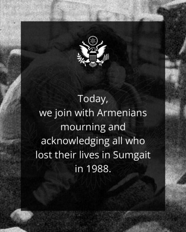 Այսօր մենք միանում ենք հայերին` սգալով և տուրք մատուցելով 1988թ․ Սումգայիթում զոհ գնացածների հիշատակին: Այս մասին հայտնում են ՀՀ-ում ԱՄՆ դեսպանատնից։